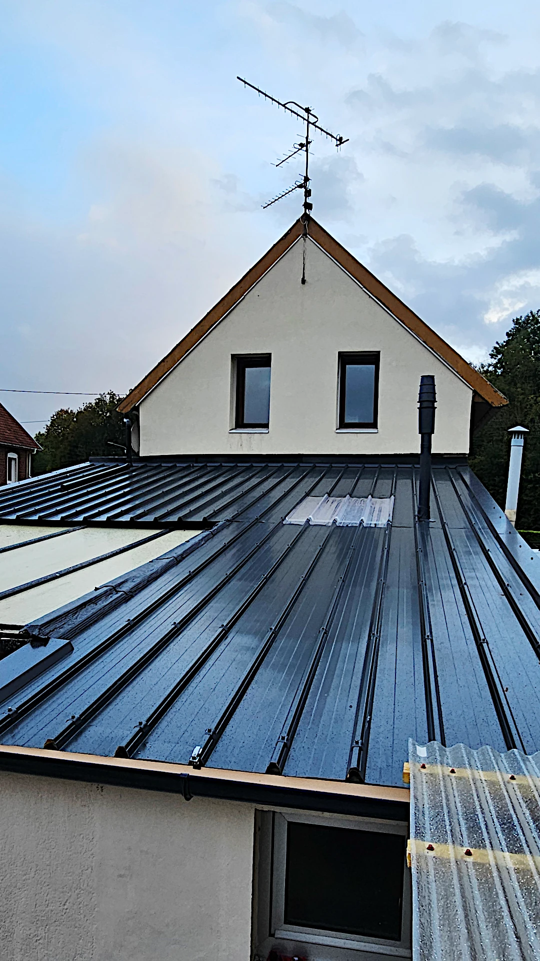 Remplacement de vielles tôles ondulé fibrociment pour des tolebac acier 4cm d'épaisseur d'isolation et pose de tôles polycarbonate de clarté avec renforcement de la structure. Durée du chantier 6 jours.