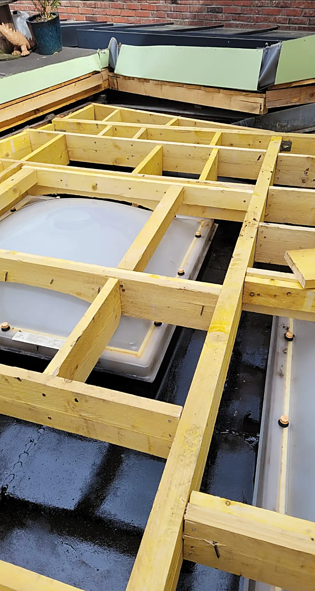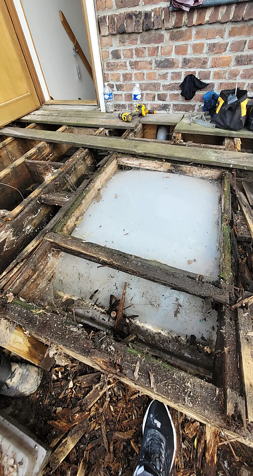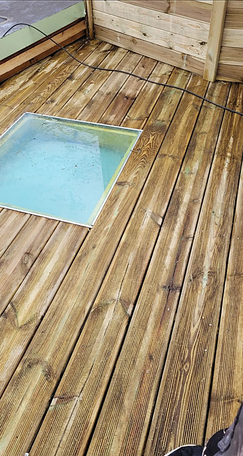 Démontage d'une ancienne terrasse en bois sur plate-forme en zinc. Étanchéité effectuée sur la plate-forme pour prévenir d'éventuel soucis d'infiltration d'eau à l'avenir puis pose d'une nouvelle terrasse. Durée du chantier 7 jours Toiture