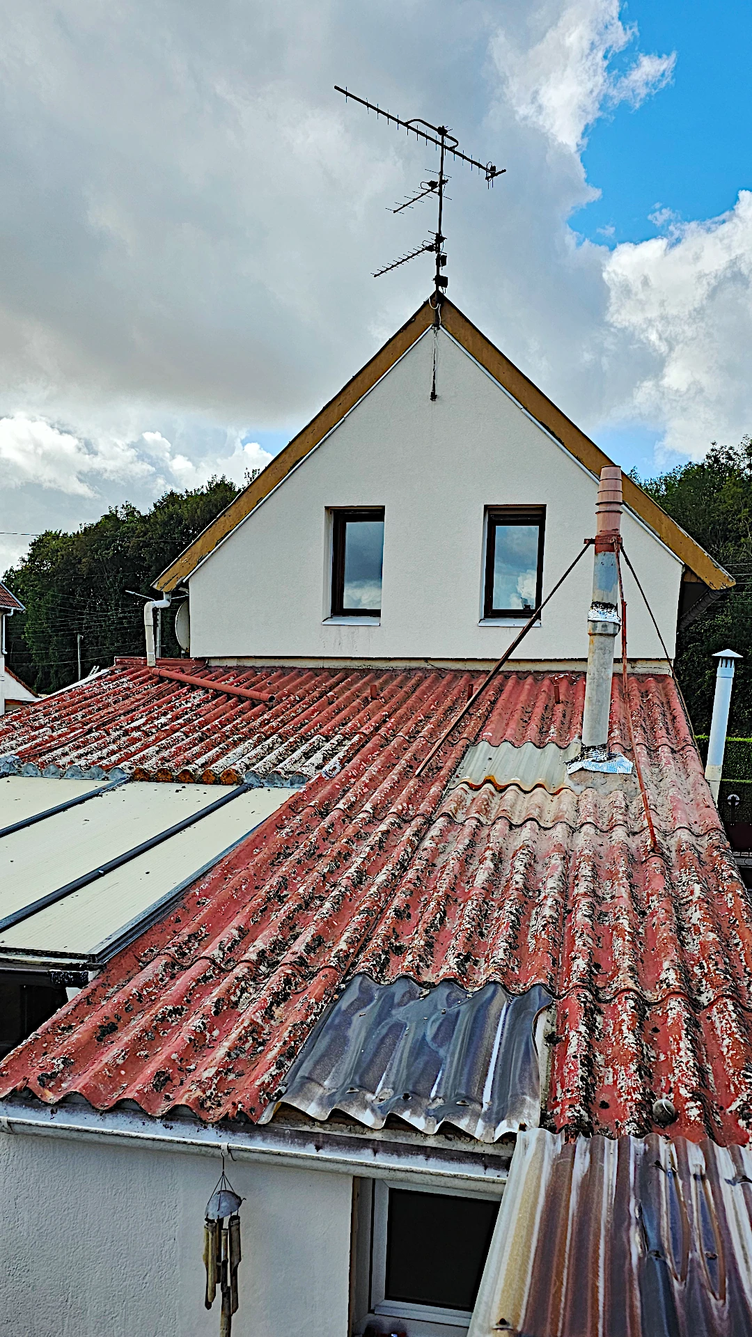 Remplacement de vielles tôles ondulé fibrociment pour des tolebac acier 4cm d'épaisseur d'isolation et pose de tôles polycarbonate de clarté avec renforcement de la structure. septembre durée 6 jours